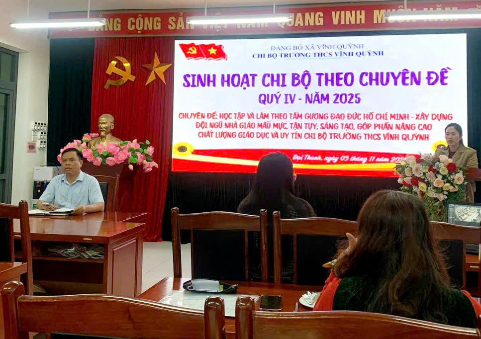 Tiếp tục quán triệt, triển khai sâu rộng việc học tập và làm theo tư tưởng, đạo đức, phong cách Hồ Chí Minh theo tinh thần Chỉ thị số 05-CT/TW của Bộ Chính trị và Kế hoạch của Đảng ủy xã Đại Thanh, ngày 03/11/2025, Chi bộ trường THCS Vĩnh Quỳnh đã tổ chức buổi Sinh hoạt Chi bộ theo chuyên đề quý IV với chủ đề: “Học tập và làm theo tấm gương đạo đức Hồ Chí Minh – Xây dựng đội ngũ nhà giáo mẫu mực, tận tụy, sáng tạo, góp phần nâng cao chất lượng giáo dục và uy tín Chi bộ trường THCS Vĩnh Quỳnh”. Việc tổ chức sinh hoạt chuyên đề quý IV/2025 là hoạt động thiết thực, nhằm tiếp tục cụ thể hóa việc học tập và làm theo tư tưởng, đạo đức, phong cách Hồ Chí Minh trong đội ngũ cán bộ, đảng viên, giáo viên, nhân viên nhà trường.