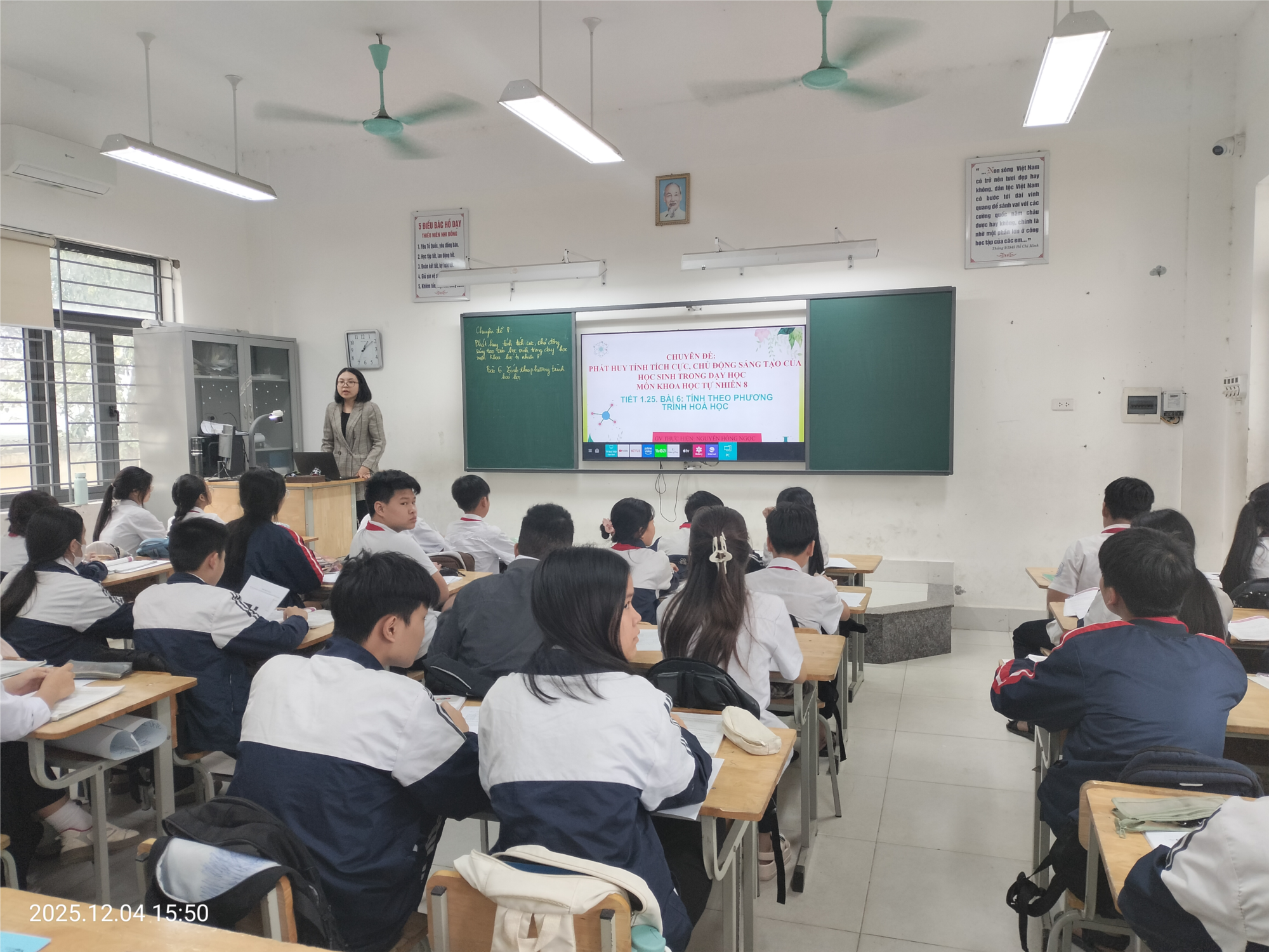 Tiết học minh họa qua bài “Tính theo phương trình hóa học” do cô giáo Nguyễn Hồng Ngọc – một giáo viên trẻ, năng động của tổ KHTN – trực tiếp thực hiện tại lớp 8A6, với sự tham dự của các thầy cô giáo trong tổ chuyên môn.