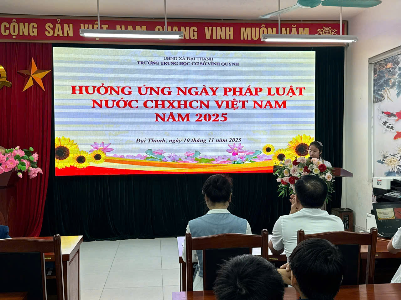 Sáng ngày 10/11/2025, Trường THCS Vĩnh Quỳnh đã tổ chức “Hưởng ứng Ngày Pháp luật nước Cộng hoà xã hội chủ nghĩa Việt Nam năm 2025” với sự tham gia của thầy cô giáo, đại diện Công ty Cổ phần xi măng Xuân Thành, công ty TNHH Vật liệu xây dựng Hương Bổng và toàn thể học sinh nhà trường. Chương trình nhằm lan tỏa tinh thần “Sống và làm việc theo Hiến pháp và pháp luật”, góp phần xây dựng môi trường học đường an toàn, văn minh và kỷ cương.