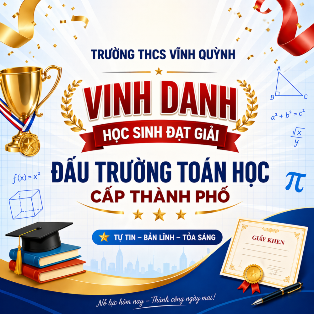 🌟 Thành tích của các em không chỉ mang lại niềm tự hào cho gia đình và nhà trường, mà còn góp phần khẳng định chất lượng giáo dục toàn diện ngày càng được nâng cao của nhà trường, đồng thời là động lực để thầy và trò Trường THCS Vĩnh Quỳnh tiếp tục phấn đấu, gặt hái thêm nhiều thành công trong các cuộc thi học sinh giỏi các cấp và sân chơi trí tuệ trong thời gian tới.
