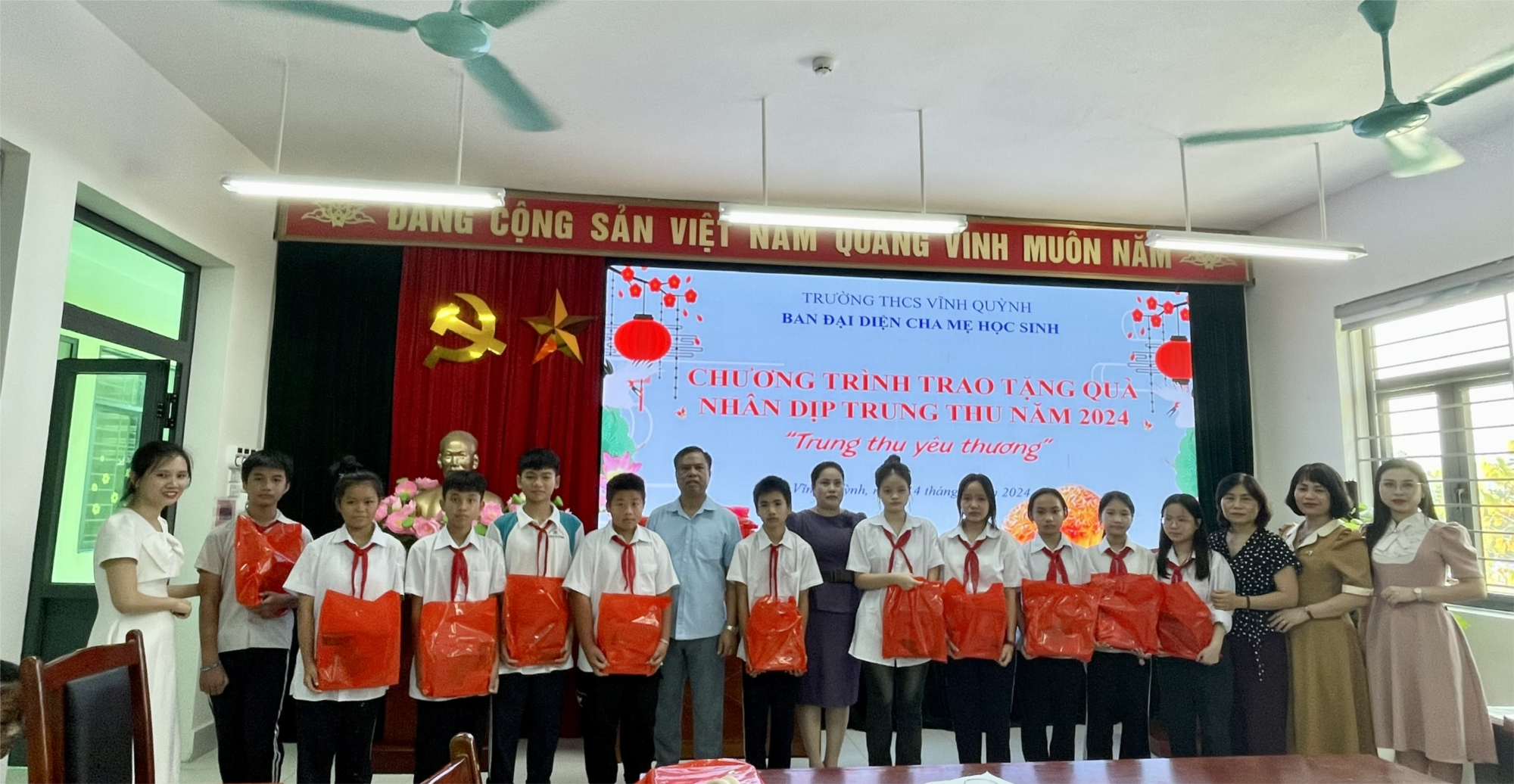Trong không khí vui tươi của Tết Trung thu, các em nhỏ lại càng háo hức chờ đón. Nhằm mang đến một mùa Trung thu ấm áp cho các em học sinh có hoàn cảnh đặc biệt, ngày 14 tháng 9 năm 2024, tại trường THCS Vĩnh Quỳnh, đã diễn ra chương trình tặng quà nhân dịp trung thu năm 2024, “Trung thu yêu thương” do trường THCS Vĩnh Quỳnh phối hợp với Ban phụ huynh nhà trường tổ chức trao tặng những phần quà Trung thu ý nghĩa cho các em học sinh có hoàn cảnh khó khăn.