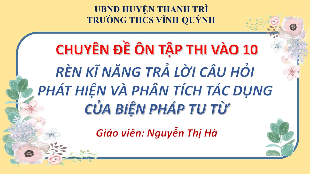 Thực hiện kế hoạch năm học 2023 – 2024, sáng ngày 8/4/2024, nhóm Ngữ văn 9 – Tổ KHXH trường THCS Vĩnh Quỳnh đã tổ chức nhân chuyên đề cấp huyện kết hợp chuyên đề cấp trường - Chuyên đề ôn thi vào 10: “Rèn kỹ năng trả lời các câu hỏi phát hiện và phân tích tác dụng của biện pháp tu từ” do cô giáo Nguyễn Thị Hà thực hiện tại lớp 9A6.
