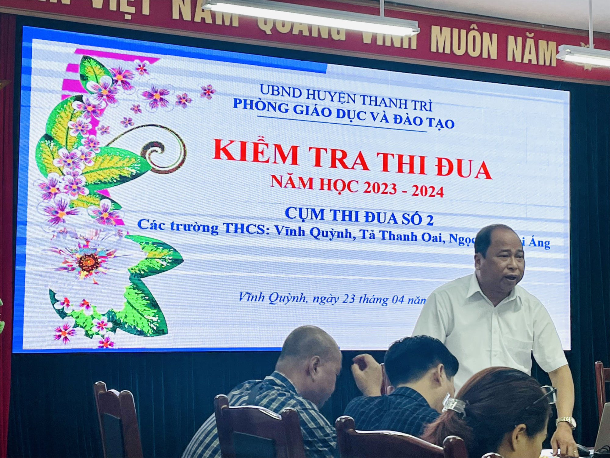 Thực hiện quyết định số 1590/QĐ-UBND, sáng ngày 23 tháng 4 năm 20224, trường THCS Vĩnh Quỳnh đăng cai đã đón tiếp đoàn kiểm tra việc thực hiện nhiệm vụ năm học 2023 - 2024 của cụm thi đua số 2, gồm các Nhà trường: THCS Vĩnh Quỳnh, THCS Đại Áng, THCS Ngọc Hồi, THCS Tả Thanh Oai. Thành phần của đoàn bao gồm: Đồng chí Phạm Văn Ngát - Trưởng phòng giáo dục đào tạo - Phó trưởng đoàn cùng các đồng chí là chuyên viên phòng GD&ĐT; Nội vụ; Văn hóa - Thông tin - Thể thao; Hội chữ thập đỏ huyện; Cán bộ quản lí các nhà trường; cộng tác viên thanh tra của Ngành giáo dục và đào tạo.