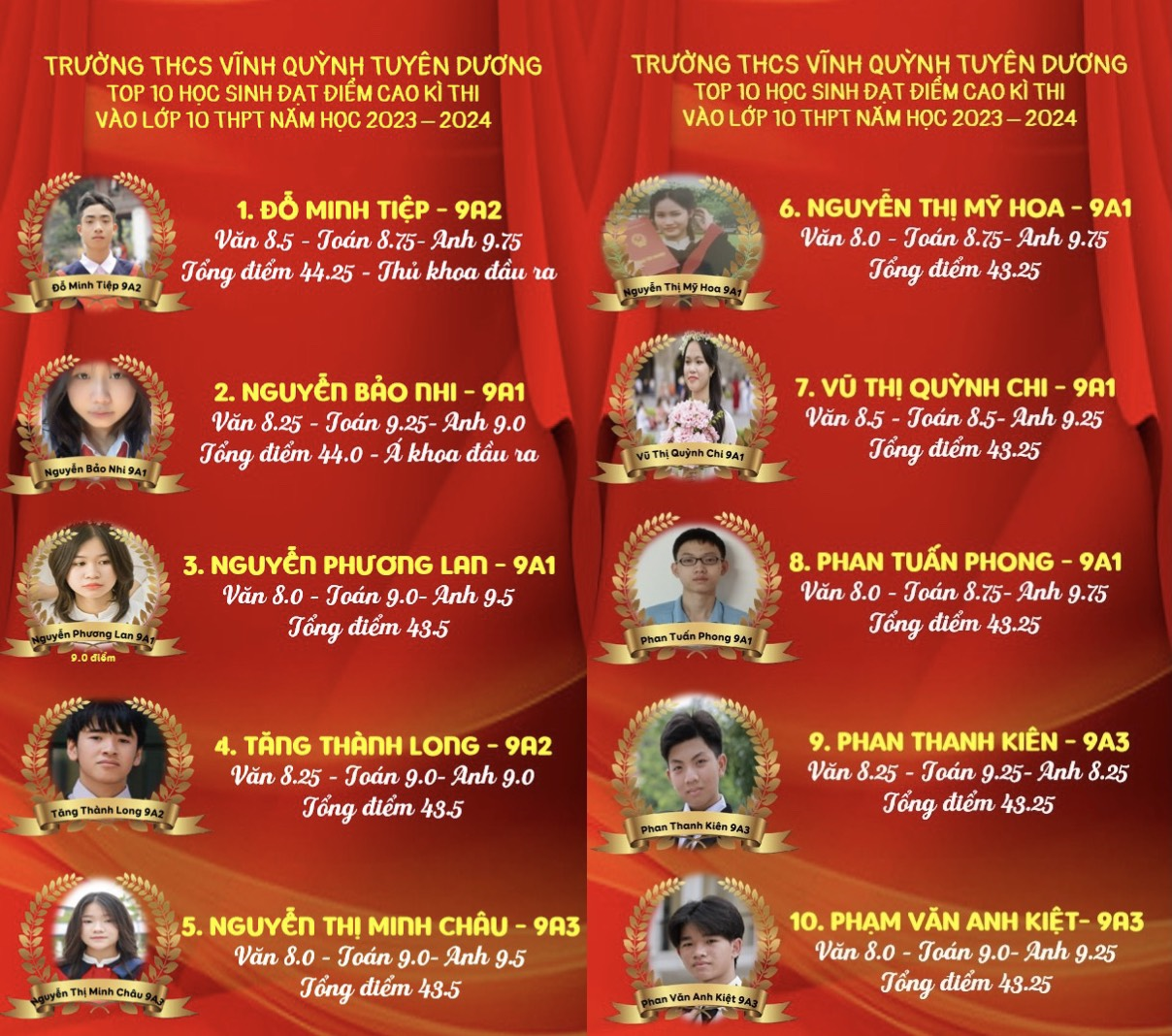 Cảm ơn các trò đã luôn nỗ lực phấn đấu học tập và rèn luyện hết mình trước những kì thi quan trọng, bằng những cố gắng không ngừng. Trường THCS Vĩnh Quỳnh luôn luôn thấu hiểu được những nỗ lực, sự phấn đấu thi đua của tất cả các em. Vì vậy, để ghi nhận và biểu dương những thành tích này, nhà trường rất vui mừng và xin được vinh danh các em học sinh đạt điểm cao trong kì thi tuyển sinh vào lớp 10 vừa qua. Nhà trường và các các thầy, cô giáo rất hi vọng rằng, các em học sinh sẽ có thêm động lực, mục tiêu học tập cụ thể, tiếp tục duy trì và cố gắng hơn nữa trong hành trình sắp tới.