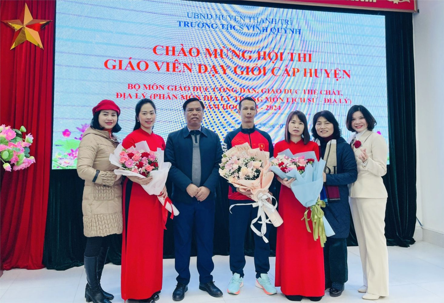 Căn cứ Kế hoạch số 35/KH PGD&ĐT ngày 10/01/2024 của Phòng Giáo dục và Đào tạo về việc tổ chức Hội thi Giáo viên dạy giỏi cấp THCS huyện Thanh Trì năm học 2023 – 2024, Trường THCS Vĩnh Quỳnh có 3 thầy, cô giáo đã tham dự cuộc thi với 3 bộ môn: Giáo dục công dân, Địa Lý và Giáo dục thể chất. Tham gia Hội thi Giáo viên dạy giỏi Trường THCS Vĩnh Quỳnh có 3 thầy, cô giáo đã tham dự cuộc thi với 3 bộ môn: Giáo dục công dân, Địa Lý và Giáo dục thể chất với 3 giáo viên tiêu biểu đại diện cho nhà trường dự thi. Đó là cô giáo Nguyễn Thị Thảo – GV môn GDCD, cô giáo Nguyễn Thị Lê Nga – GV môn Địa lý, thầy giáo Dương Vũ Hoàng Linh – GV môn GDTC. Với lòng yêu nghề, mến trẻ, tất cả vì học sinh thân yêu và có tinh thần trách nhiệm cao các thầy cô đã luôn nỗ lực phấn đấu để hoàn thành tốt phần thi của mình. Qua cuộc thi, các thầy cô đã vinh dự đạt được các thành tích sau: