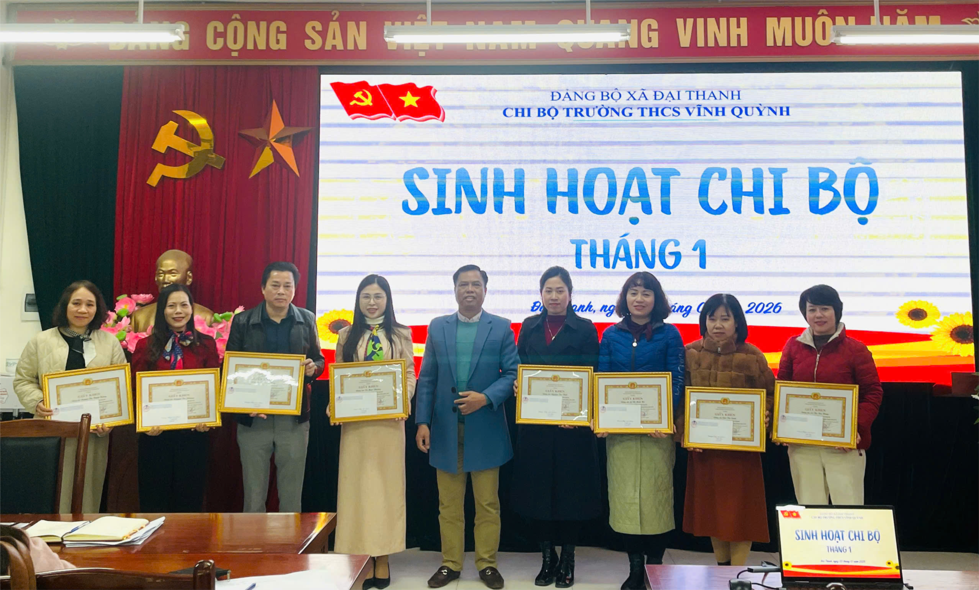 Thực hiện kế hoạch công tác Đảng năm 2026, trong không khí thi đua mừng Đảng – mừng Xuân và hướng tới những nhiệm vụ trọng tâm của năm học 2025-2026, Chi bộ Trường THCS Vĩnh Quỳnh đã tổ chức sinh hoạt chi bộ định kỳ tháng 01 năm 2026 vào 16h 40 ngày 05/01/2026 tại phòng HĐSP nhà trường với tinh thần nghiêm túc, dân chủ và trách nhiệm cao.