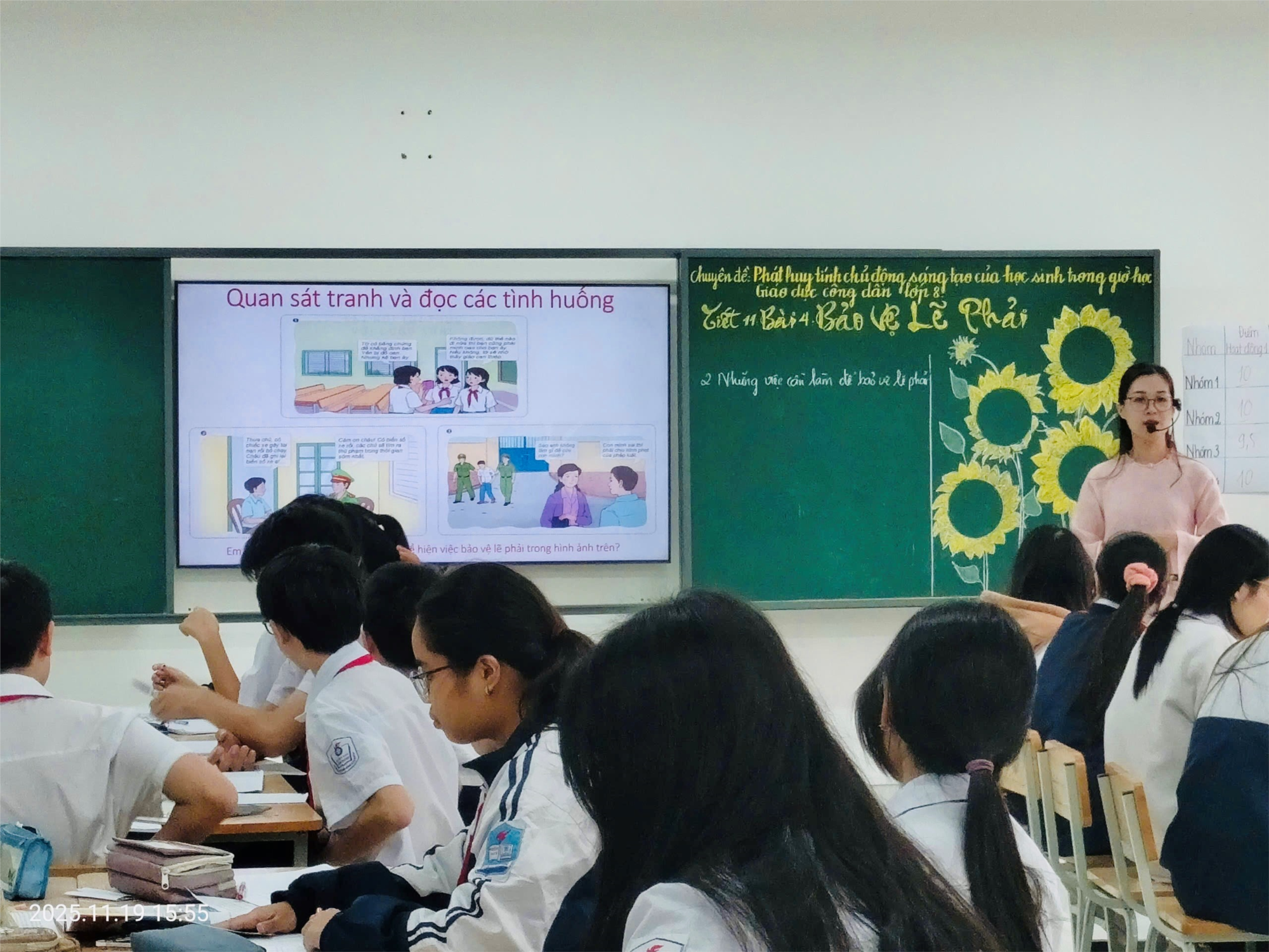 Trên bảng và màn hình trình chiếu, cô Quỳnh sử dụng nhiều tư liệu trực quan – tranh minh họa tình huống, câu hỏi mở, nhiệm vụ nhóm – giúp bài học trở nên gần gũi, dễ tiếp cận. Cô đứng ở vị trí trung tâm lớp học, nhẹ nhàng dẫn dắt, đặt câu hỏi gợi mở và khuyến khích học sinh mạnh dạn nêu quan điểm của mình. Hình ảnh những cánh hoa hướng dương rực rỡ trên bảng viết cũng góp phần tạo điểm nhấn đẹp mắt, đồng thời thể hiện sự đầu tư chu đáo cho tiết dạy.