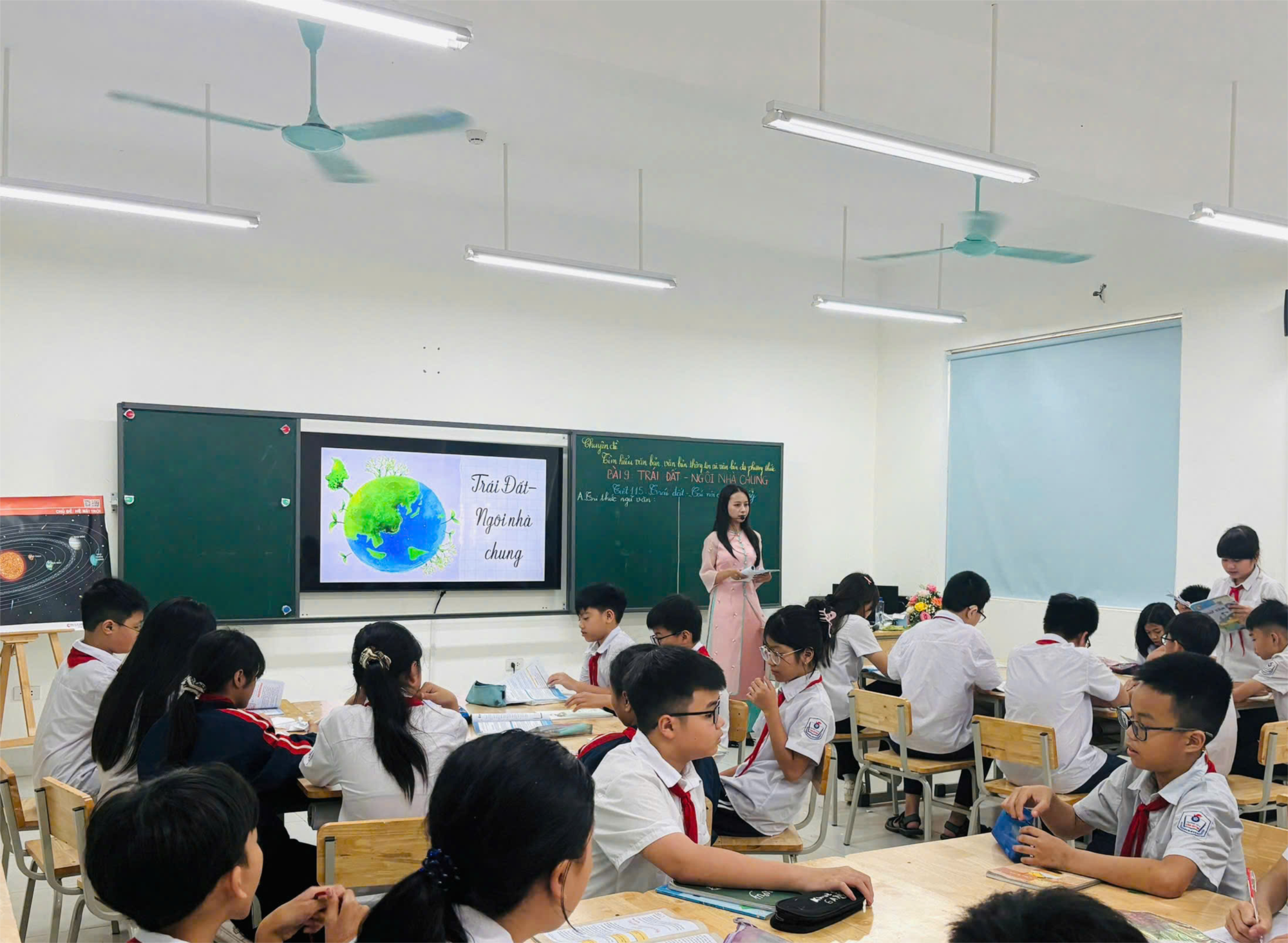 Tiết học diễn ra trong không khí sôi nổi, hào hứng với sự tham gia tích cực của học sinh. Ngay từ phần khởi động, cô giáo đã khéo léo dẫn dắt học sinh bằng những câu hỏi gợi mở về hành tinh xanh, giúp các em bước đầu hình dung được vai trò đặc biệt của Trái Đất đối với sự sống. Nội dung bài học được triển khai logic, kết hợp linh hoạt giữa giảng giải, thảo luận nhóm và trình bày ý kiến, từ đó phát huy tính chủ động và khả năng tư duy của học sinh.
