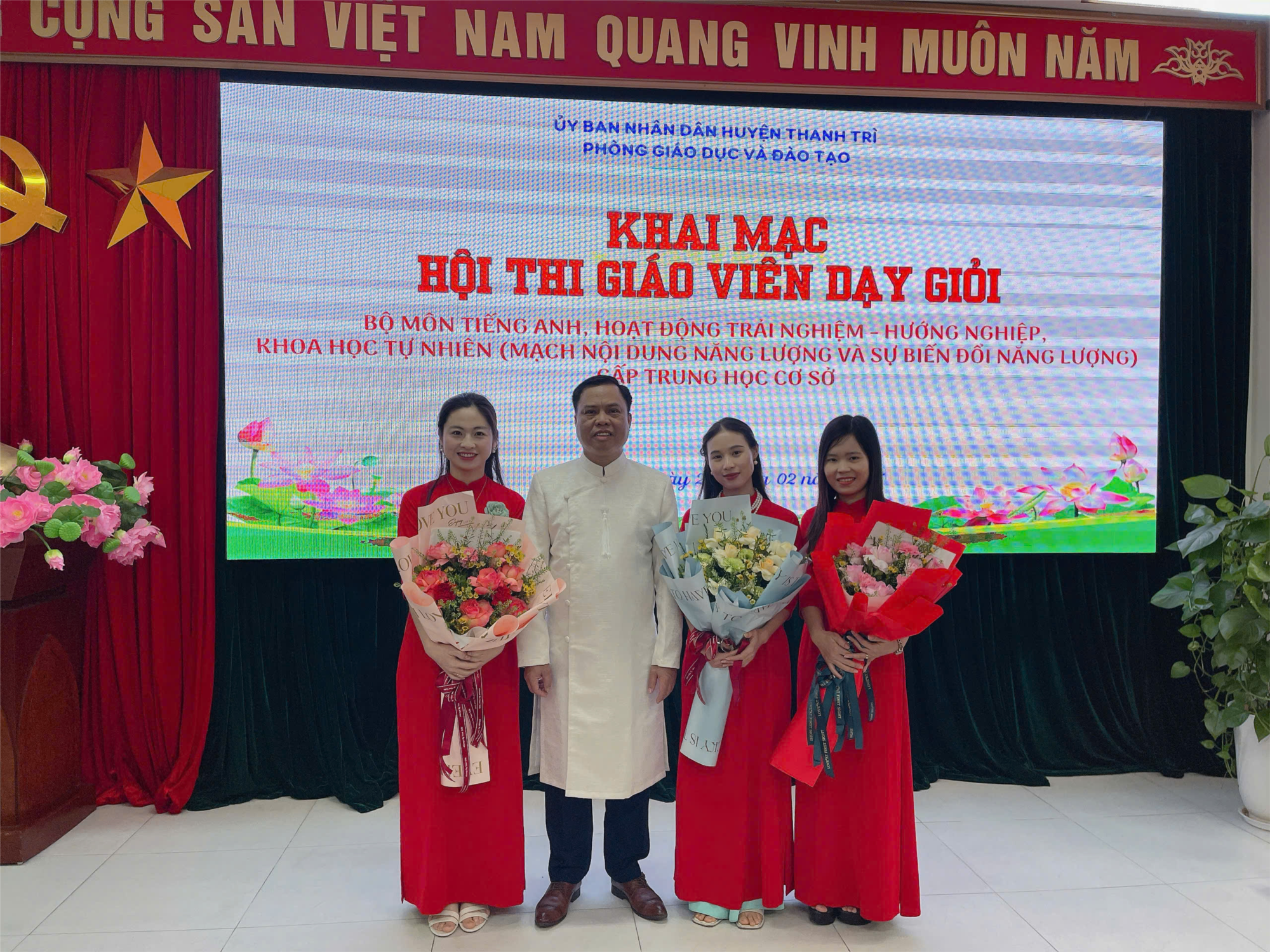 Mở đầu hội thi, Thầy Lê Thịnh, Hiệu trưởng nhà trường, đã có những lời phát biểu động viên, khích lệ tinh thần các giáo viên tham gia cuộc thi. Thầy gửi lời chúc may mắn đến tất cả các cô giáo và mong muốn cuộc thi sẽ là cơ hội để các giáo viên không chỉ thể hiện tài năng mà còn phát huy sự sáng tạo trong công tác giảng dạy. Các thầy cô giáo trong cấp uỷ Chi bộ, BGH nhà trường, BCH công đoàn, các thầy cô trong tổ đã có những bó hoa tươi thắm gửi tặng các cô và cùng lưu lại một số khoảnh khắc đáng nhớ: