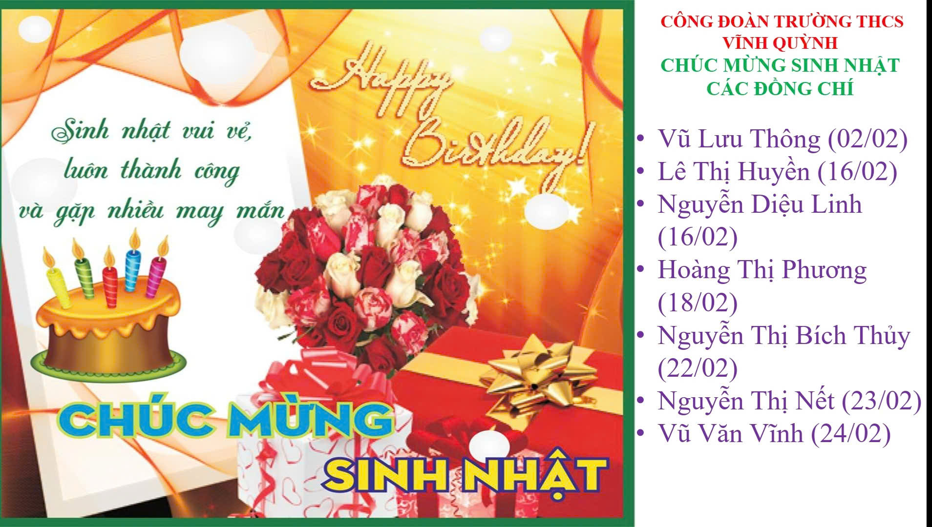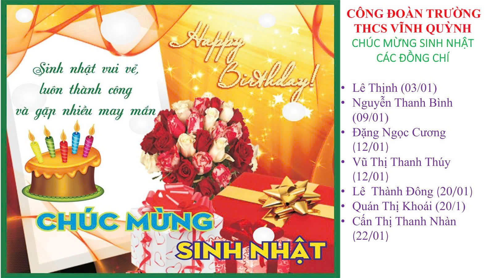 Nhằm tri ân và tôn vinh vai trò của nữ cán bộ, giáo viên, nhân viên trong nhà trường, Công đoàn sẽ tổ chức chương trình Kỉ niệm Ngày Quốc tế Phụ nữ 8/3, đồng thời gửi lời chúc mừng sinh nhật đến các đồng chí có ngày sinh trong quý I/2025. Đây sẽ là dịp để các công đoàn viên giao lưu, gắn kết và cùng nhau nhìn lại những đóng góp ý nghĩa của đội ngũ nữ giáo viên, nhân viên nhà trường.