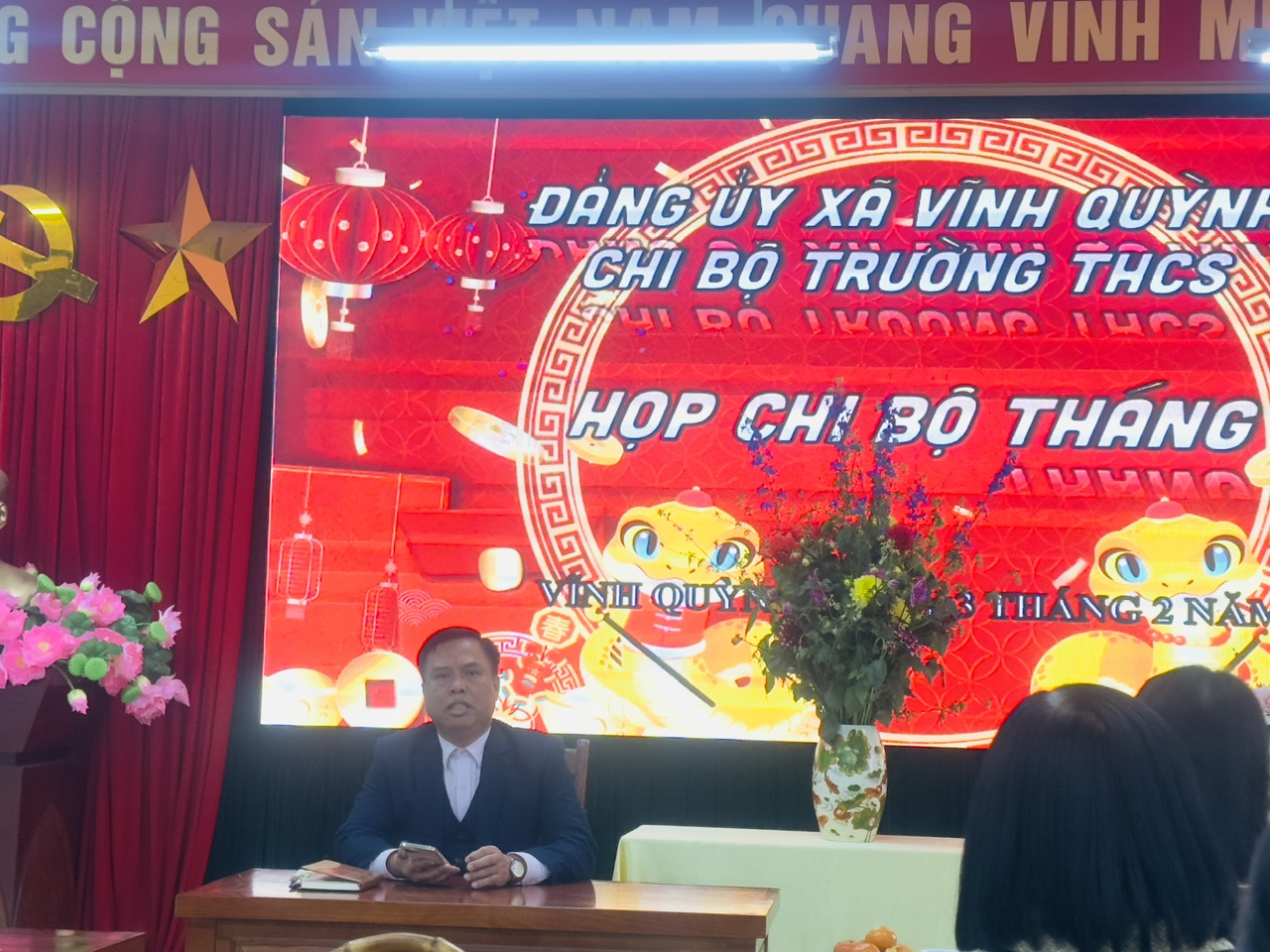 Thực hiện theo kế hoạch công tác của Chi bộ trường THCS Vĩnh Quỳnh, vào 11h sáng ngày 3 tháng 02 năm 2025, tại phòng hội đồng trường THCS Vĩnh Quỳnh, Chi bộ trường THCS Vĩnh Quỳnh tổ chức buổi họp thường kỳ tháng 2 năm 2025.
