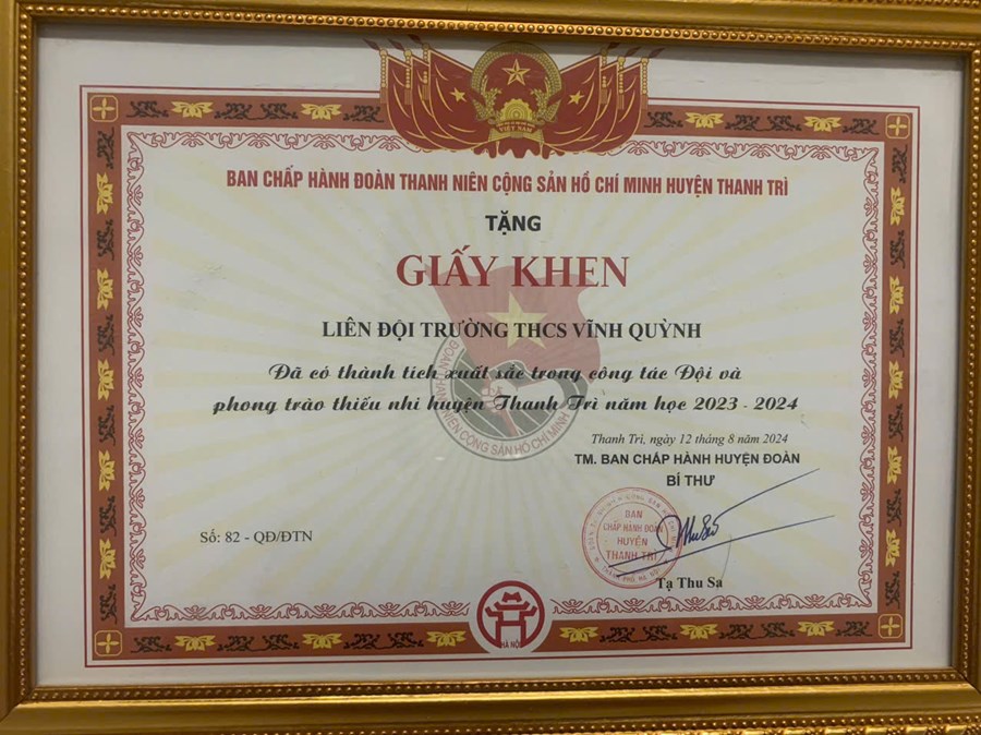 Với những thành tích xuất sắc trong công tác Đoàn, Đội và các phong trào thiếu nhi, Liên đội Trường THCS Vĩnh Quỳnh đã được giấy khen, khen thưởng tại Hội nghị Tổng kết công tác Đoàn, Đội cấp huyện năm 2024