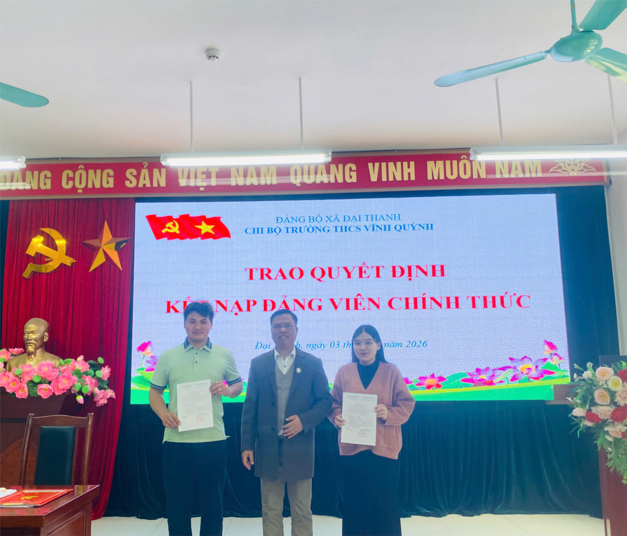 Tại buổi họp, Chi bộ đã tiến hành trao Quyết định công nhận Đảng viên chính thức cho hai đồng chí: Đặng Ngọc Cương và Triệu Thị Huế sau thời gian rèn luyện, phấn đấu trong thời gian dự bị. Việc được công nhận là Đảng viên chính thức là dấu mốc quan trọng, ghi nhận quá trình nỗ lực, tu dưỡng và trưởng thành của hai đồng chí trong công tác cũng như trong hoạt động của Chi bộ.