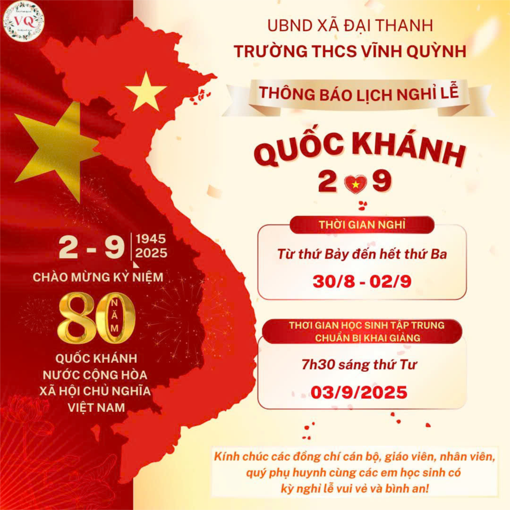 Trường Trung học cơ sở Vĩnh Quỳnh trân trọng thông báo đến toàn thể cán bộ, giáo viên, nhân viên và học sinh về lịch nghỉ lễ Quốc khánh 2/9 như sau: