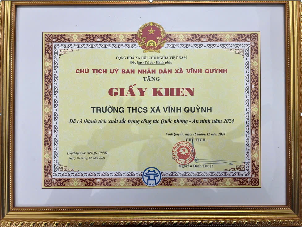 Hòa chung trong không khí hân hoan kỉ niệm 80 năm ngày thành lập Quân đội Nhân dân Việt Nam (22/12/1944) và 35 năm ngày hội Quốc phòng toàn dân (22/12/1989 – 22/12/2024), trường Trung học cơ sở Vĩnh Quỳnh vô cùng tự hào khi được đón nhận Giấy khen của Chủ tịch Ủy ban nhân dân xã Vĩnh Quỳnh vì đã có thành tích xuất sắc trong công tác Quốc phòng – An ninh năm 2024.