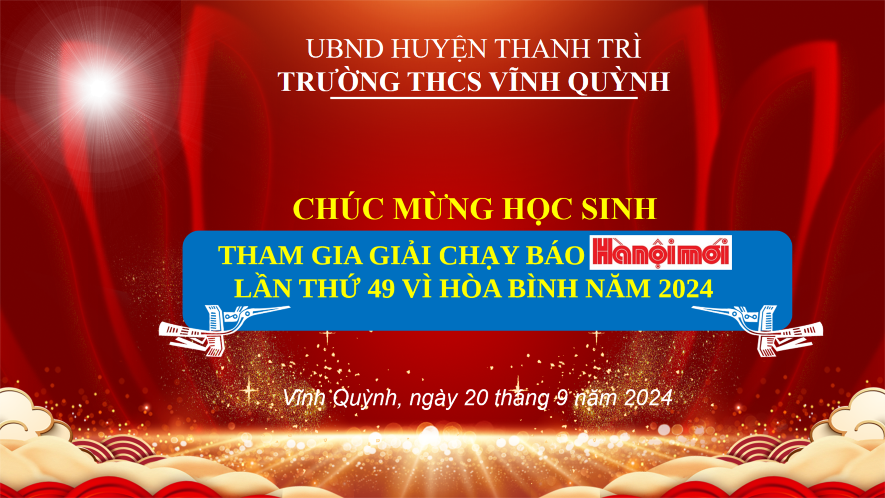 7h00 ngày 22/09/2024, tại Trung tâm văn hóa thể dục thể thao huyện Thanh Trì, diễn ra chung kết Giải chạy Báo Hànộimới mở rộng lần thứ 49 - Vì hòa bình năm 2024 dành cho các trường trên dịa bàn huyện Thanh Trì.