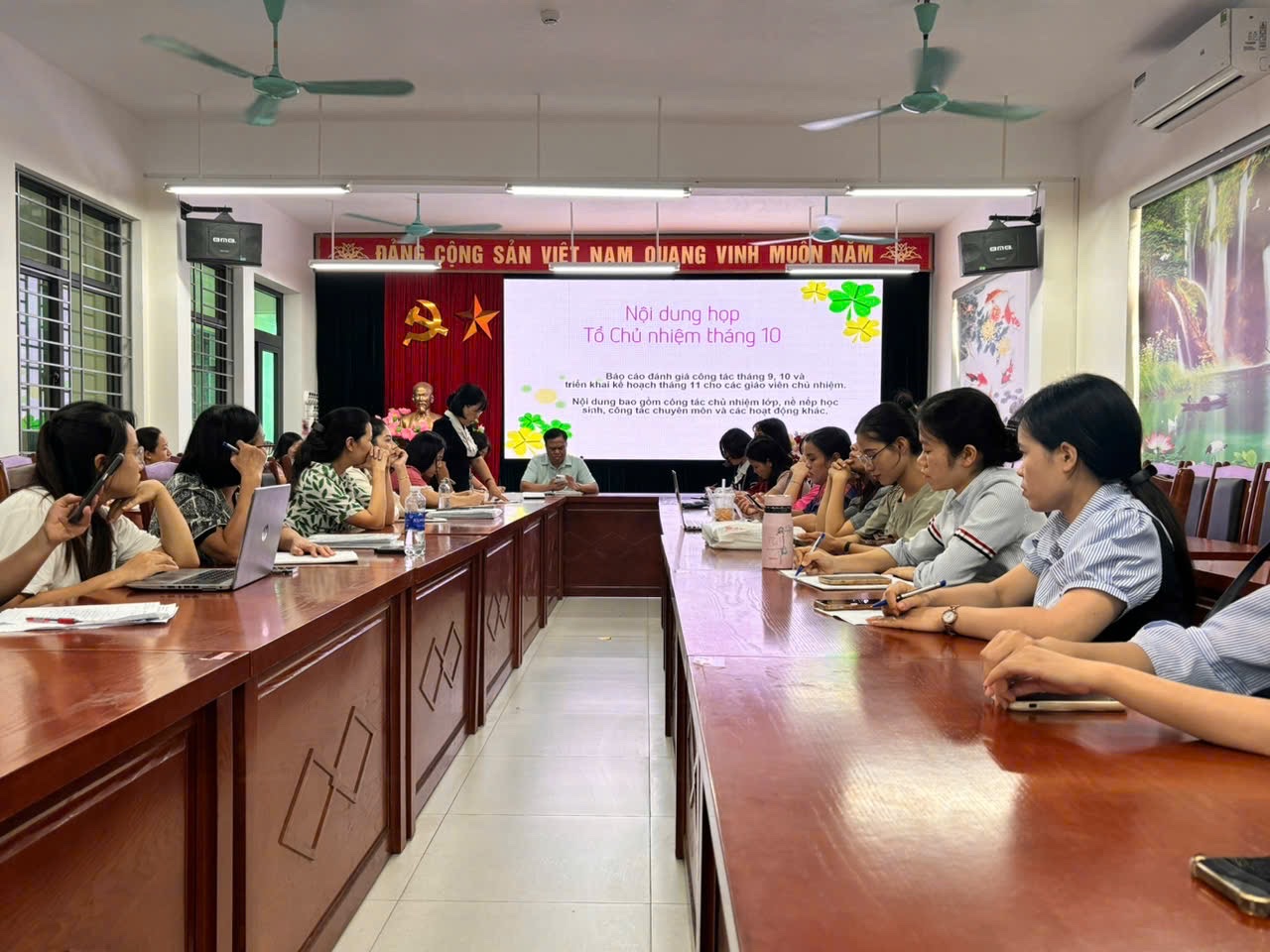 Buổi họp tháng 10 của trường THCS Vĩnh Quỳnh tập trung vào những nội dung thiết thực: tổng kết tình hình học tập và rèn luyện của học sinh, đánh giá các hoạt động kỷ niệm ngày Phụ nữ Việt Nam 20/10, và chuẩn bị cho các hoạt động sôi nổi sẽ diễn ra trong tháng 11, đặc biệt là dịp kỷ niệm Ngày Nhà giáo Việt Nam 20/11.