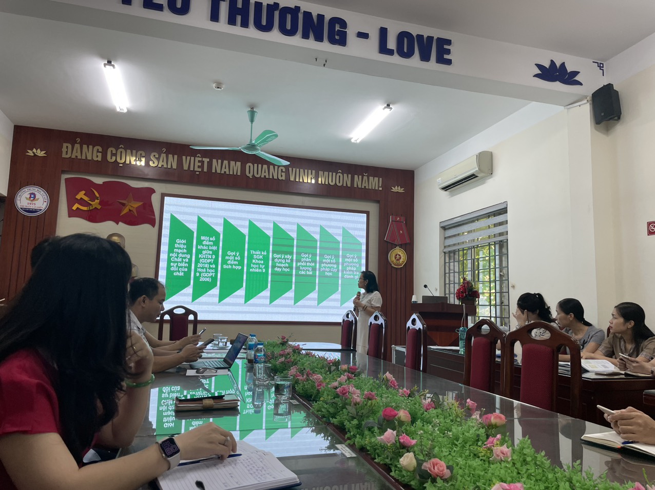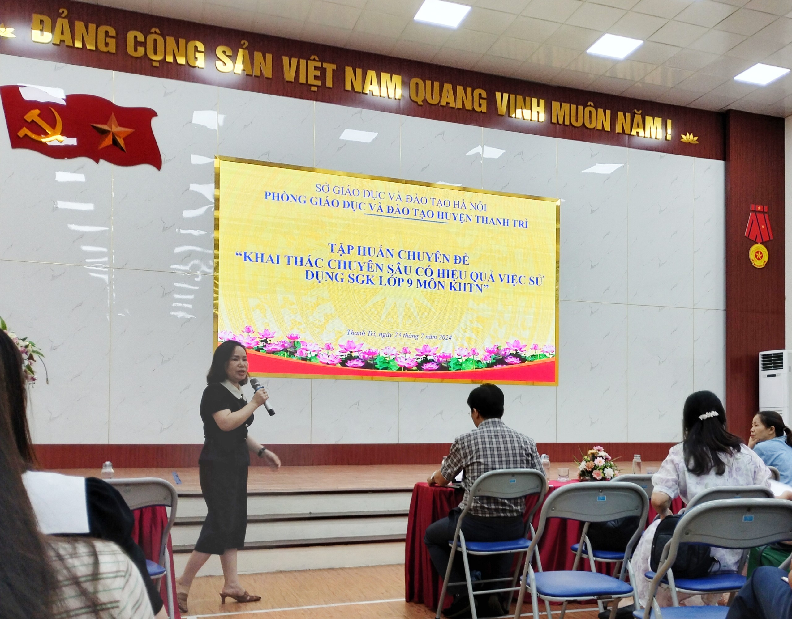 Để khai thác có hiệu quả việc sử dụng và giảng dạy sách giáo khoa Khoa học tự nhiên lớp 9, Phòng GD&ĐT huyện Thanh Trì đã tổ chức tập huấn cho 100% các đồng chí cán bộ quản lý, giáo viên dạy môn KHTN trên địa bàn huyện trong 2 ngày 23-24/7/2024. Theo kế hoạch, đúng 8h ngày 23/7/2024, toàn bộ giáo viên dạy môn Khoa học tự nhiên của trường THCS Vĩnh Quỳnh đã có mặt tại trường THCS Thị trấn Văn Điển để tham dự tập huấn chuyên đề “Khai thác chuyên sâu có hiệu quả việc sử dụng SGK lớp 9 môn KHTN”.