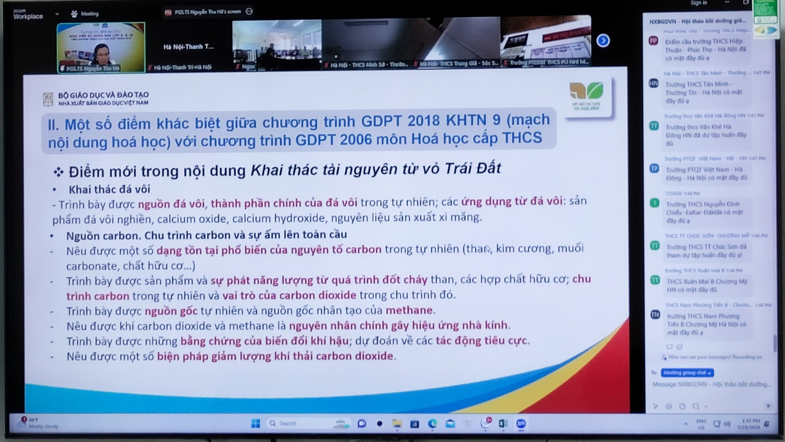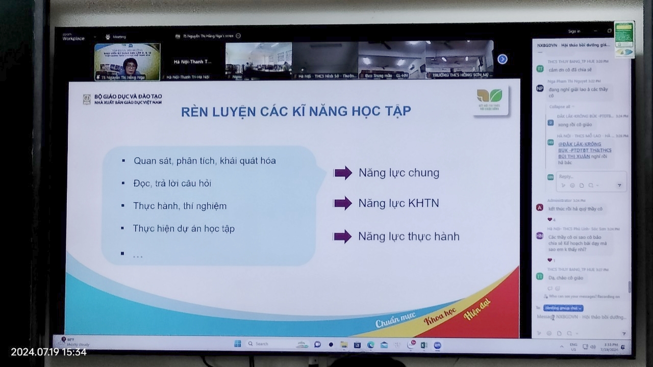 Để nâng cao năng lực cho giáo viên sử dụng sách giáo khoa triển khai Chương trình giáo dục phổ thông 2018, thực hiện Công văn số 2296/SGDĐT-GDTrH ngày 05/7/2024 của Sở Giáo dục và Đào tạo Hà Nội, kế hoạch số 799/KH-PGD&ĐT của Phòng Giáo dục và Đào tạo Thanh Trì, ngày 19/7/2024, các giáo viên dạy môn Khoa học tự nhiên của trường THCS Vĩnh Quỳnh đã tích cực tham gia tập huấn SGK môn Khoa học tự nhiên lớp 9 (Bộ sách Kết nối tri thức với cuộc sống) với hình thức trực tuyến.