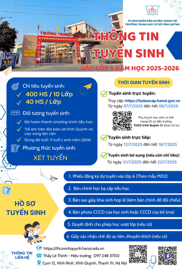 Thực hiện kế hoạch số 63/KH-THCSVQ ngày 04/04/2025 về việc tuyển sinh vào lớp 6 năm học 2025-2026 của trường THCS Vĩnh Quỳnh, ngày 25/07/2025 Hội đồng tuyển sinh trường THCS Vĩnh Quỳnh chính thức khép lại kỳ tuyển sinh vào lớp 6 năm học 2025-2026 với tổng số học sinh tuyển được là 357 em.