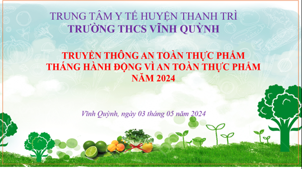 Trẻ em là mầm non tương lai của đất nước, do vậy mà việc làm sao để trẻ phát triển toàn diện là câu hỏi được đặt ra. Một trong số đó là an toàn vệ sinh thực phẩm trong trường học – chủ đề được nhiều phụ huynh đặc biệt quan tâm. Vào lúc 15h ngày 03/05/2024, một sự kiện quan trọng đã diễn ra tại trường THCS Vĩnh Quỳnh, phối hợp cùng Trung tâm Y tế huyện Thanh Trì, đánh dấu một bước tiến mới trong công cuộc đảm bảo an toàn vệ sinh thực phẩm cho thế hệ tương lai của chúng ta. Buổi truyền thông với chủ đề “Tháng hành động vì an toàn thực phẩm năm 2024” đã quy tụ toàn thể nhân viên y tế các trường học trong địa phương cùng nhau chia sẻ, thảo luận và cam kết hành động.